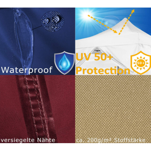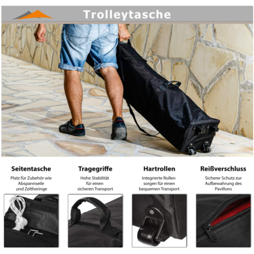 Stabilná oceľová konštrukcia a kvalitná polyesterová strecha s PVC vrstvou zaručujú dlhú životnosť a jednoduchú údržbu. Výškovo nastaviteľné nohy a praktická taška na kolieskach umožňujú jednoduché prenášanie aj skladovanie stanu.