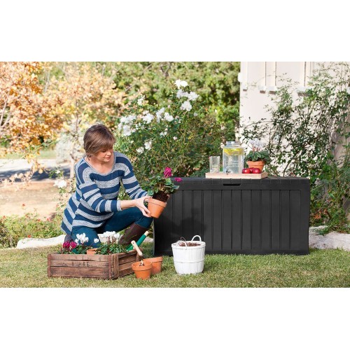 Plastový box pro uložení nejrůznějších předmětů (podušky, zahradní náčiní...) od firmy KETER. Výhodou tohoto boxu je jednoduchá montáž (bez využití nářadí - vše složíte jak stavebnici), vysoká kvalita boxu a moderní design. Materiál má UV ochranu a je odolný nepřízni počasí. Udrží až 200kg a tak ho můžete využít také jako lavičku. Vzhled boxu napodobuje strukturu dřeva - plastový box v imitaci dřeva.