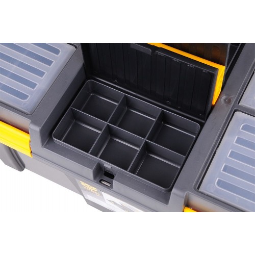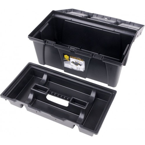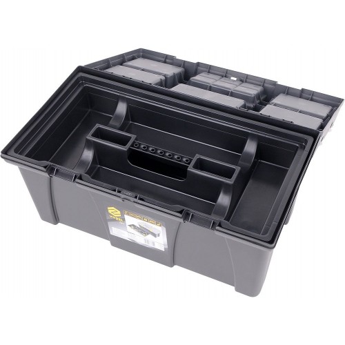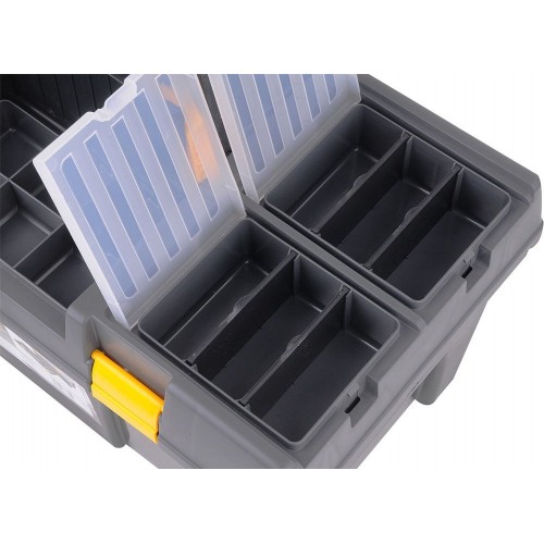 Plastový kufor s dvomi vyberateľnými organizérmi na veku a vnútornou vyberateľnou vložkou na drobné predmety.