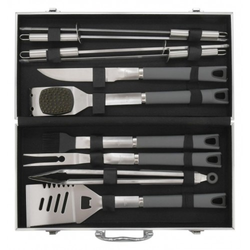 V sade sa nachádza obracačka s precízne zabrúsenou hranou vybavená vlnitým ostrím, otváračom zátok a otvormi pre odtok. Kliešte, špeciálne tvarované pre istý úchop najrôznejších pokrmov, kefa pre údržbu grilu, kedy samotná kefová časť je z mosadze. Nevyhnutnou časťou grilovacieho náradia je aj dvojzubá vidlička, štetec so štetinami z nylonu pre potieranie pokrmov, porcovací nôž a 4 grilovacie ihlice s hrotmi brúsenými do špičky. Všetko náradie je dizajnovo jednoduché a nie je nijak zbytočne tvarované, čo významne uľahčuje čistenie. Grilovacie náradie je navyše doplnené o pohodlné silikónové rukoväte a všetky nástroje možno zavesiť za háčiky. Sada je úhľadne umiestnená v transportnom kufri, hodí sa najmä pre náročnejších užívateľov, jej prehľadnosť a rozsah rôznych nástrojov však ocení ktokoľvek.