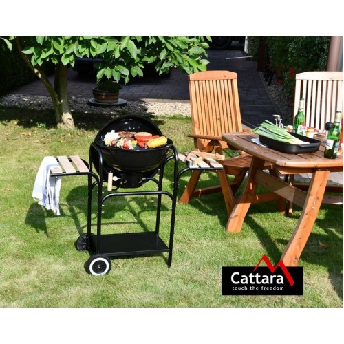 Konštrukcia je vyrobená z kvalitného oceľového plechu so smaltovanou povrchovou úpravou. Držadlo na veku je drevené a poskytuje dostatočný priestor pre úchop. Stabilitu grilu zaisťujú kovové nohy doplnené o spevňujúci rám v spodnej časti. Spodná časť je navyše vybavená kolieskami z plastu, ktoré zaručujú dostatočnú pohyblivosť. Gril je vybavený regulovateľnou ventiláciou a vysúvacím popolníkom. Veko je úplne odnímateľné, z vnútornej strany vybavené hákom pre zavesenie na bok grilu. Pre samotnú tepelnú prípravu Vašich pochutín má gril rošt z chrómovanej ocele. Odkladací priestor pozostáva z dvoch drevených poličiek s rozmermi 31 x 21 cm umiestnených na bokoch grilu.