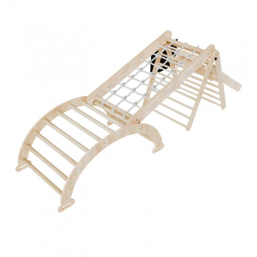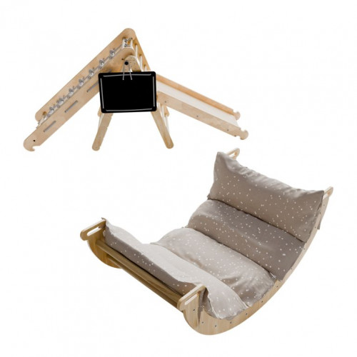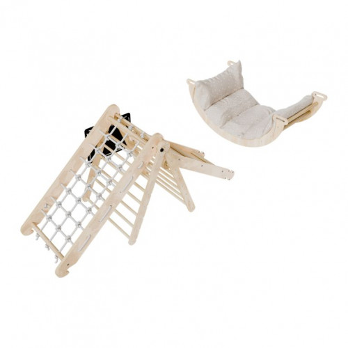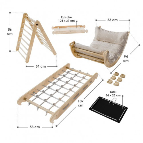 Konštrukcia je vyrobená z kvalitného borovicového dreva a preglejky, ktoré zaisťujú stabilitu a dlhú životnosť. Každý prvok unesie až 50 kg a vďaka modulárnemu prevedeniu je možné jednotlivé časti ľahko kombinovať aj prispôsobovať priestoru. Pohodlný bavlnený vankúš spríjemní hojdanie, zatiaľ čo praktická tabuľka dáva priestor na kreatívne vyjadrenie. Sada je určená na vnútorné použitie a pri hre sa odporúča umiestniť pod konštrukciu mäkkú podložku pre maximálnu bezpečnosť.