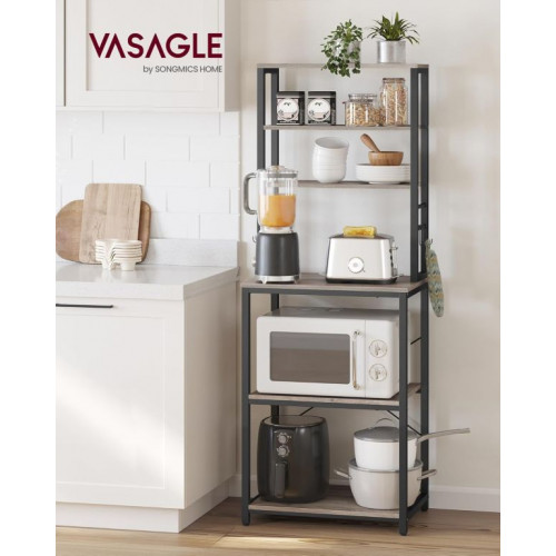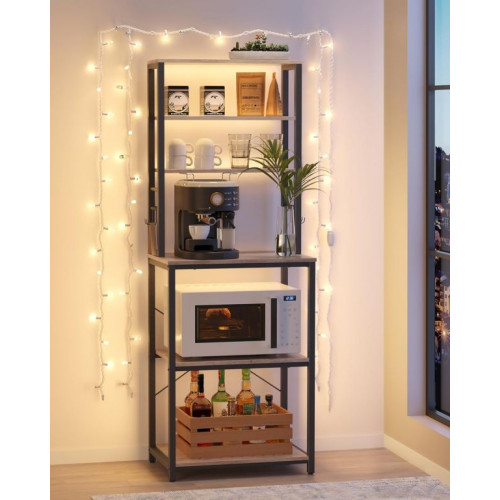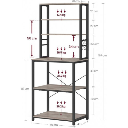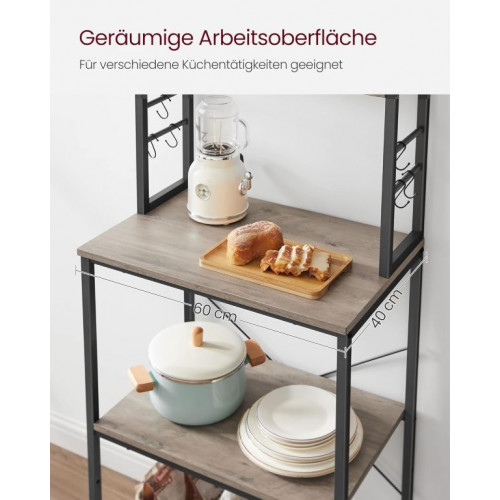 Vneste do svojho domova prehľadnosť a štýl. Tento praktický kuchynský regál s rustikálnym dreveným dekorom a čiernou oceľovou konštrukciou dodá interiéru osobitý industriálny nádych. Šesť políc a šesť háčikov ponúkajú dostatok priestoru pre mikrovlnku, kávovar aj kuchynské potreby. Vďaka univerzálnemu dizajnu sa hodí nielen do kuchyne, ale aj do jedálne, pracovne či obývacieho priestoru.