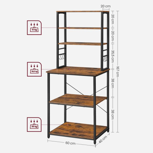 Vylepšite svoju kuchyňu elegantnou a praktickou policou, ktorá ponúka veľa úložného priestoru aj v menších miestnostiach. Šesť políc a šesť háčikov vám umožnia mať všetko pekne usporiadané a vždy po ruke.