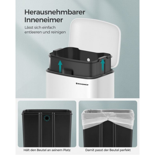 Oceľová konštrukcia v kombinácii s vysoko kvalitným plastom zaručuje odolnosť a jednoduchú údržbu. Vnútorná nádoba s rukoväťami umožňuje rýchle vyprázdňovanie a umývanie, zatiaľ čo otvor na upevnenie vrecka udržuje všetko na svojom mieste. Ideálna voľba pre každodenné použitie.