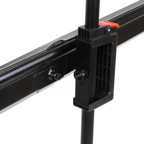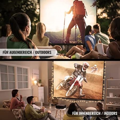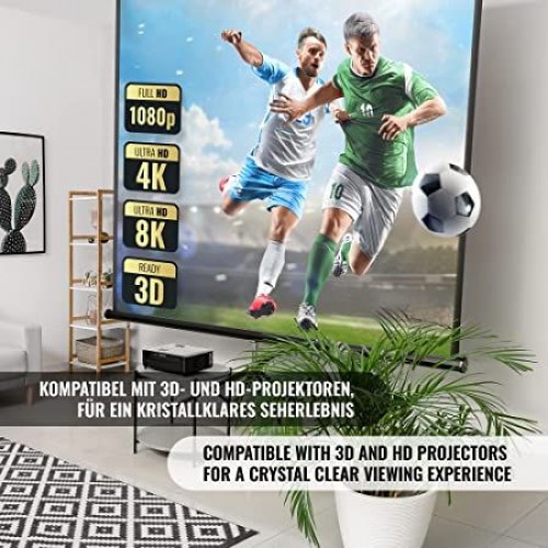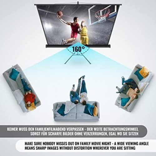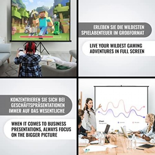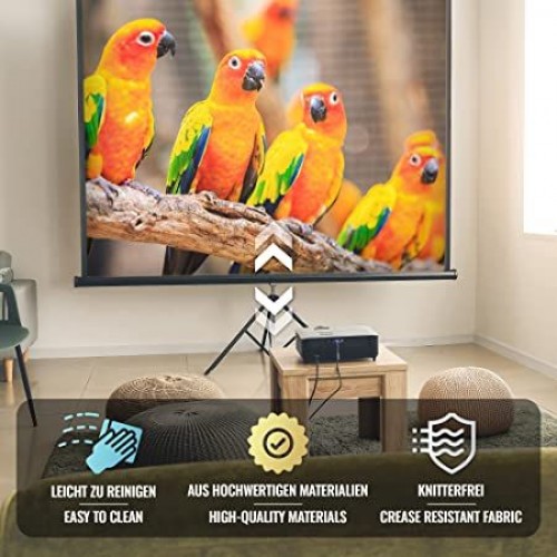 Robustný kovový statív zaisťuje bezpečný stojan. Plátno je vyrobené z trojvrstvovej tkaniny a je potiahnutý vinylom, takže sa ľahko čistí. Čierne maskovanie okrajov po stranách a čierna zadná strana plátna zaisťujú optimálny kontrast. Záťažová tyč zabraňuje zbytočným záhybom.