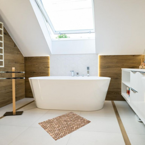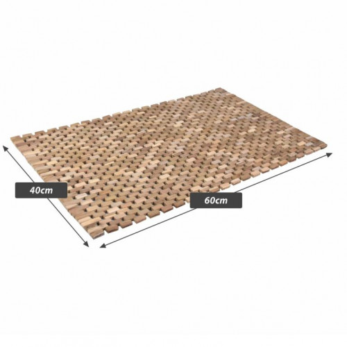 Nezáleží na tom, či v kúpeľni, v saune, na balkóne alebo vo vstupnom priestore, táto všestranná protišmyková predložka dodá vašej izbe prirodzený šmrnc a eleganciu. Predložku je možné po použití zrolovať a uložiť, aby sa ušetrilo miesto. Gumové podložky zaistia, že predložka zostane na svojom mieste a nešmýka sa. Táto predložka je unikátny kus ručne vyrobený z teakového dreva. Preto sa môžu od vyobrazeného výrobku vyskytnúť drobné odchýlky v tvare, farbe a veľkosti, ktoré nie sú dôvodom na reklamáciu, ale skôr podčiarkujú jedinečnosť výrobku.