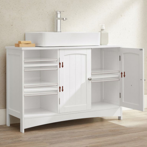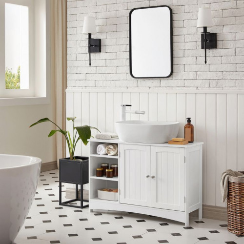 Vnesiete sviežosť a poriadok do vašej kúpeľne s touto štýlovou umývadlovou skrinkou. Biela povrchová úprava, elegantné dvierka s drážkami a chrómové úchytky dodávajú vašej kúpeľni moderný vzhľad a pocit čistoty. Otvorené a uzavreté police vám umožňujú mať všetko, čo potrebujete, po ruke alebo diskrétne uložené.