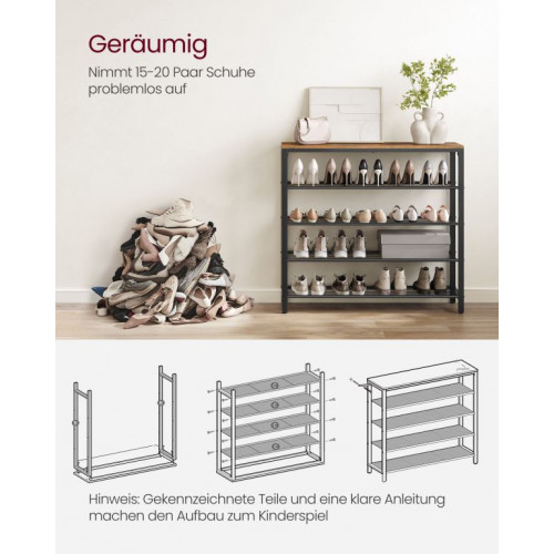 Váš domov si zaslúži nielen poriadok, ale aj štýl. Botník VASAGLE kombinuje rustikálne hnedé drevo s čiernym oceľovým rámom a prináša do predsiene industriálny nádych. Štyri vzdušné kovové police pojmú obuv celej rodiny, zatiaľ čo horná doska poslúži na tašku, kľúče alebo dekorácie.