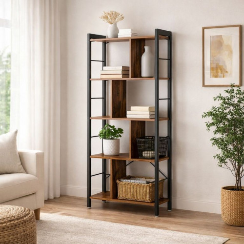 Dajte svojim knihám priestor, ktorý si zaslúži. Tento 4-poschodový regál v rustikálnom štýle dodá interiéru charakter a teplo dreva, zatiaľ čo čierna oceľ mu prepožičia moderný industriálny vzhľad. Hodí sa do obývacej izby, pracovne i kancelárie a skvele ladí s rôznymi typmi nábytku.