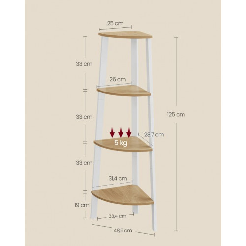 Táto moderná rohová polica kombinuje prírodný dub a matnú bielu oceľ a ponúka elegantné riešenie pre každý interiér. Štyri odkladacie police vytvárajú krásny priestor pre vaše knihy, kvety, dekorácie alebo praktické drobnosti v akejkoľvek miestnosti. Vďaka trojnožkovému dizajnu a nastaviteľnej zadnej nohe stojí stabilne aj na mierne nerovných podlahách, zatiaľ čo bezpečnostná súprava proti prevráteniu zabraňuje náhodnému prevráteniu.