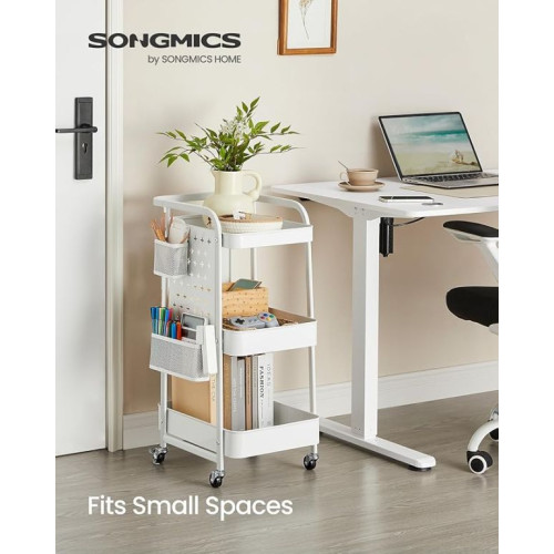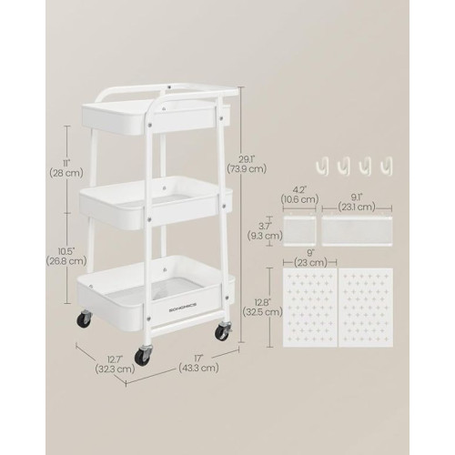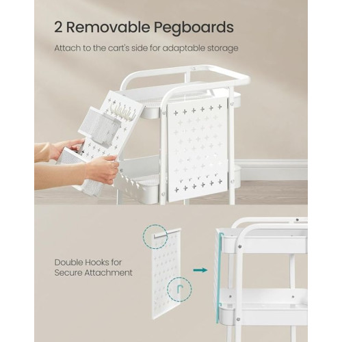 Objavte univerzálny mobilný regál, ktorý vám pomôže udržiavať poriadok v každej miestnosti. Vďaka trom priestranným policám, háčikom a dodatočným doskám s otvormi môžete ľahko uložiť všetko, čo potrebujete – od kuchynského riadu až po kreatívne potreby. Elegantný biely dizajn sa perfektne hodí do moderného interiéru a umožňuje vám mať všetko po ruke.