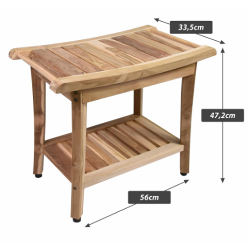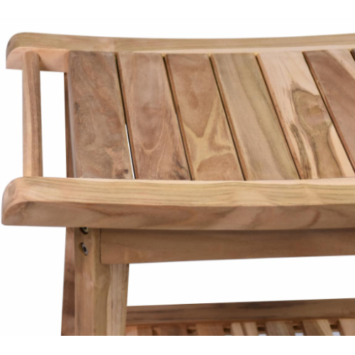 Tento dekoratívny a praktický kúsok bude určite ozdobou vášho domova, predsiene, kúpeľne a ďalších miestností. Stolička je obzvlášť atraktívna vďaka svojmu zakrivenému sedadlu a pevným, masívnym a robustným dreveným častiam. Praktická kúpeľňová stolička ponúka priestor na sedenie – je ľahko montovateľná, nastaviteľná a umiestniteľná. Vľavo a vpravo od sedadla sme namontovali tyče, na ktoré môžete zavesiť predmety, ako sú použité uteráky. Využite dodatočný úložný priestor na veľkej polici pre nepoužité uteráky, kúpeľňové doplnky a mnoho ďalšieho. Lavica je vhodná nielen do kúpeľne, ale aj do predsiene – môže slúžiť aj ako botník alebo polička. Stolek je vyrobený z teakového dreva – zaujme svojou prirodzenou kresbou a je ľahko udržiavateľný. Každý stolek je ručne vyrobený, a preto je vždy jedinečný. Rozmery sa môžu mierne líšiť a kresba dreva je vždy individuálna. Drevo nie je ošetrené. Použitie vonku vo vetre, nepriaznivom počasí a daždi je na vlastné riziko. Neodporúčame to; bohužiaľ nemôžeme akceptovať žiadne reklamácie súvisiace s počasím. Drevo použité pri výrobe pochádza z udržateľných plantáží.