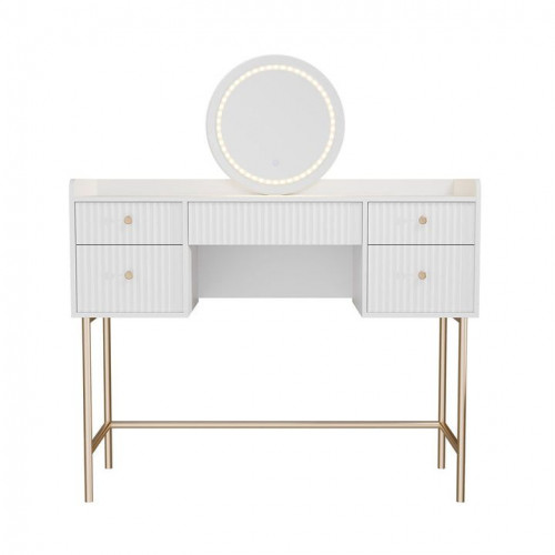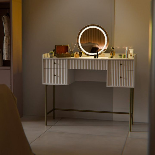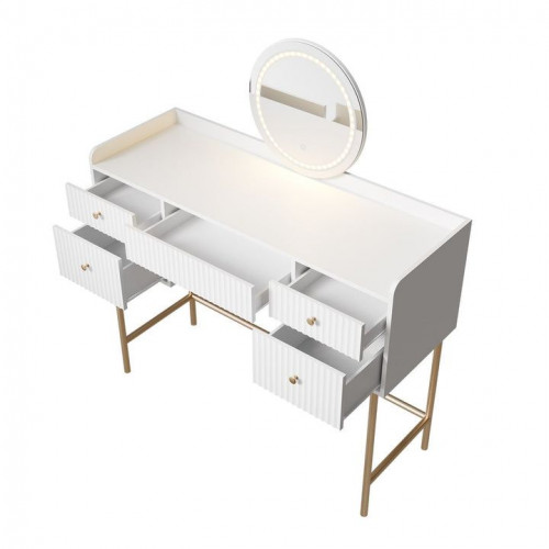 Toaletný stolík s LED zrkadlom, 5 zásuviek, biela/zlatá