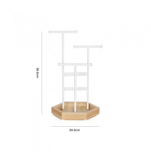 Hexagonálna drevená základňa zaisťuje stabilitu, zatiaľ čo tri T-tyče v rôznych výškach umožňujú zavesenie rôznych druhov šperkov. 16 otvorov poskytuje miesto pre náušnice a prstene. Jednoduchá montáž vďaka skrutkám a gumovým tesneniam.