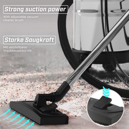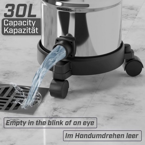 Priemyselný vysávač je vhodný na jemné aj hrubé nečistoty. To znamená, že ho môžete použiť okrem iného na vysávanie prachu, nečistôt, drevených častíc, omrviniek a vlákien. Vďaka štrbinovej hubici, dlhej hadici a káblu vysávača ľahko dosiahnete na všetky miesta v miestnosti. Náš vysávač na mokré a suché vysávanie je vybavený 3 filtrami: papierový filter, penový filter a patrónový filter. Až budete mať dosť zbierania lístia, jednoducho zoberte tento multifunkčný vysávač, prepnite ho do režimu fúkania a práca je behom okamihu hotová. Viacúčelový vysávač má odtok vody v spodnej časti, vďaka čomu sa veľmi ľahko vyprázdňuje. Okrem toho je vďaka kolieskam o 360 ° veľmi mobilný.