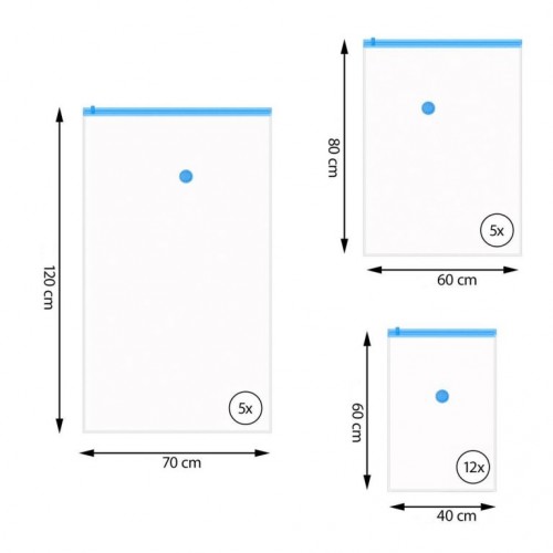 Vďaka modernej tesniacej technike sáčky spoľahlivo udržujú vzduch trvale a opakovane. Skladovacie vaky možno ľahko vysať pomocou vysávača a vďaka dvojitému tesneniu a špeciálnemu ventilu trvale udržiavajú podtlak. Textílie sú vo vákuovom vaku chránené pred škodlivým vplyvom prostredia ako je vlhkosť, pachy, škodcovia alebo plesne. Vákuové sáčky vytvárajú miesto vo vašom šatníku alebo cestovnom kufri. Vrecia možno ľahko pomocou ručnej pumpy odsať, čo prináša úsporu priestoru cca 80 %. Či už doma v skrini, pre uloženie sezónneho oblečenia alebo pri cestovaní. Naše vákuové sáčky sú praktickými pomocníkmi v domácnosti. Vrecká sú vyrobené z robustného transparentného plastu PA + PE.
