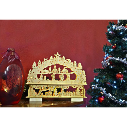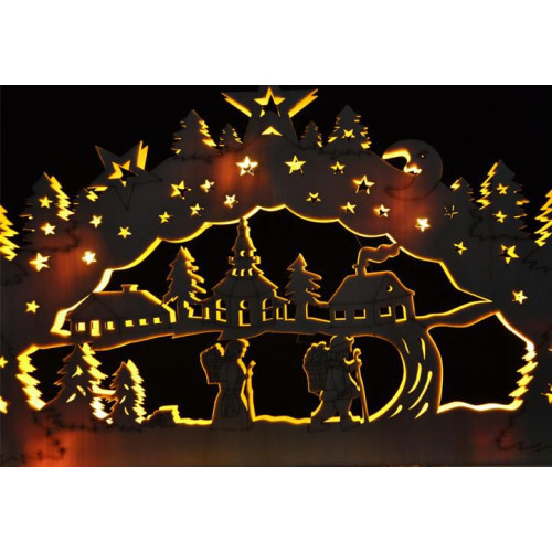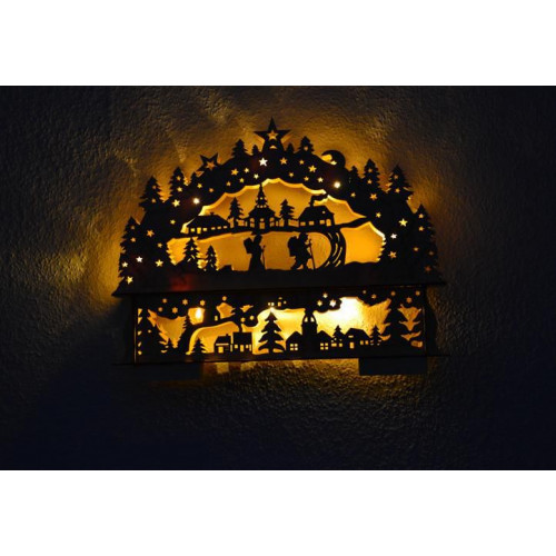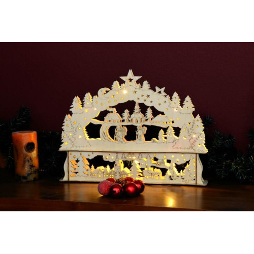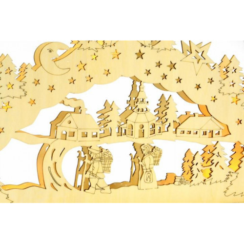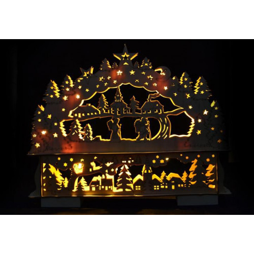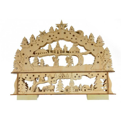 Krásna vianočná dekorácia s dvojitým rámom je vhodná pre umiestnenie na okno, komodu alebo k stromčeku - zaručene vykúzli úžasnú zimnú atmosféru! Oblúk je vyrobený z preglejky a obsahuje 10 LED diód, ktoré celú zimnú krajinu krásne osvetlia. Oblúk je upevnený na podstavec, do ktorého sa vkladajú batérie a je na ňom umiestnený spínač.