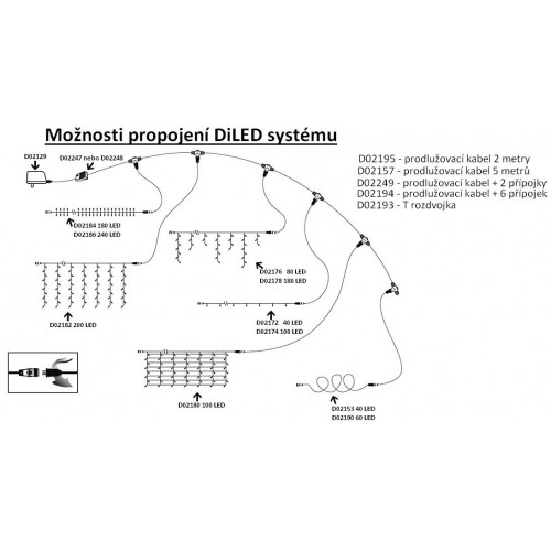 Systém vianočného osvetlenia diLED je jedinečný vďaka neskutočným možnostiam napájania a rozširovania reťazí. Môžete si vybrať z celej ponuky a reťaze na seba vzájomne napájať a vďaka ovládaču pridávať aj svetelné funkcie. Systém diLED sa už kvalitou približuje profesionálnemu osvetleniu. Priemerná životnosť LED žiaroviek je približne 50 000 hodín svietenia.