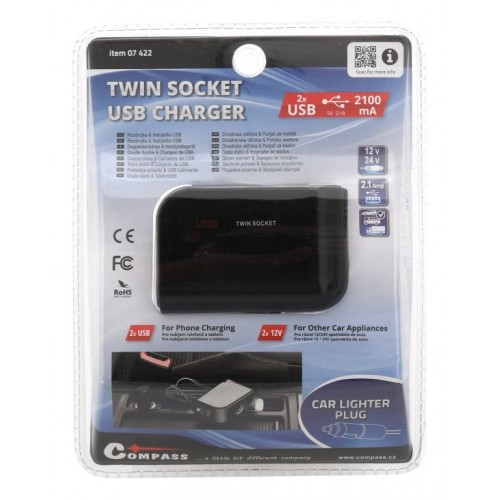 Navyše je adaptér opatrený 2x USB zástrčkami vhodnými pre MP3 prehrávače, mobilné telefóny a ďalšie zariadenia, ktoré sa nabíjajú či napájajú bežným USB zdrojom 5 V až do príkonu 2100 mA. V sade sa nachádza aj samolepiaca podložka na upevnenie zariadenia na ľubovoľnom mieste.