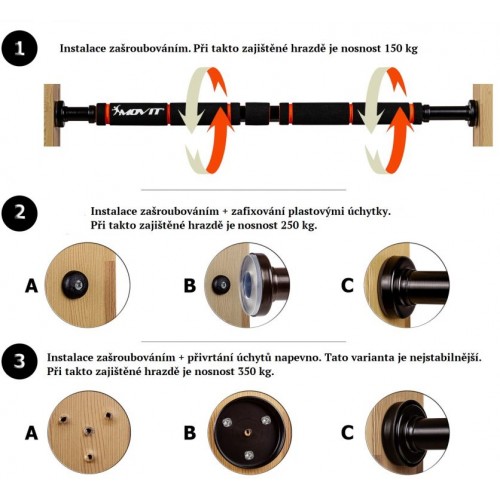 Hrazda na cvičenie MOVIT® pre pohodlné cvičenie doma aj na cestách! Nastaviteľná dĺžka, vďaka ktorej ju môžete nainštalovať individuálne do každých dverí. Dĺžka sa môže meniť od 63 cm do 100 cm jednoduchým odskrutkovaním vonkajšej kĺbovej hlavice pomocou závitu. Ideálne pre posilňovanie chrbtových partií, brucha a paží. Hrazdu je možné upevniť do vrchnej časti dverí pre príťahy a posilňovanie chrbta a paží, ale aj do spodnej časti dverí pre sedy-ľahy a posilňovanie brušných svalov. Vďaka jednoduchej inštalácii je možné hrazdu vždy po cvičení zložiť. Hrazdu je tiež možné pripevniť skrutkami, ktoré sú súčasťou balenia, ale nie je to podmienkou.