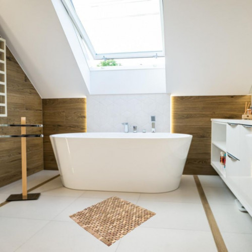 Nezáleží na tom, či v kúpeľni, v saune, na balkóne alebo vo vstupnom priestore, táto všestranná protišmyková predložka dodá vašej izbe prirodzený šmrnc a eleganciu. Predložku je možné po použití zrolovať a uložiť, aby sa ušetrilo miesto. Gumové podložky zaistia, že predložka zostane na svojom mieste a nešmýka sa. Táto predložka je unikátny kus ručne vyrobený z teakového dreva. Preto sa môžu od vyobrazeného výrobku vyskytnúť drobné odchýlky v tvare, farbe a veľkosti, ktoré nie sú dôvodom na reklamáciu, ale skôr podčiarkujú jedinečnosť výrobku.