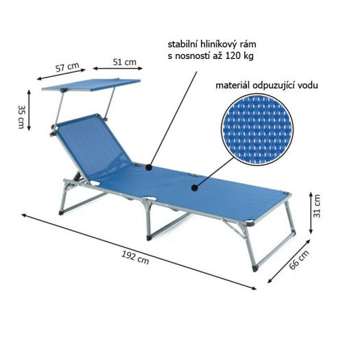 Oddýchnite si pri bazéne, na záhrade, na kúpalisku, v saune, zimnej záhrade alebo v kempe. Či už na relaxáciu pri čítaní knihy, k spánku alebo na opaľovanie. Strieška je sklopná, možno si ju tak ľubovoľne nastaviť. Ležadlo je pokryté materiálom, ktorý odpudzuje vodu a nevyžaduje špeciálnú údržbu. Rám je veľmi stabilný vďaka trom nohám. Nohy sú vybavené protišmykovou ochrannou krytkou, ktorá takisto prispieva k lepšej stabilite lehátka. Lehátko je sklopné a možno ho ľahko prepravovať a úsporne uskladniť.