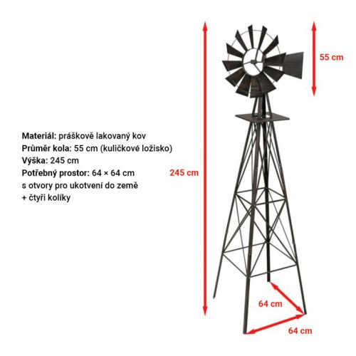 Náš veterný mlyn sa skladá z robustného oceľového rámu a je chránený proti korózii, náterom odolným proti poveternostným vplyvom. Mlyn je k dispozícii v rôznych farbách. So svojou výškou 245 cm je skutočnou ozdobou Vašej záhrady, na jej postavenie je potrebná plocha 64 x 64 cm.