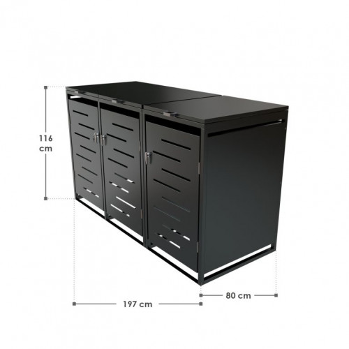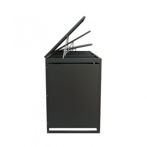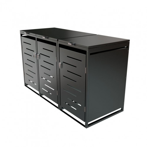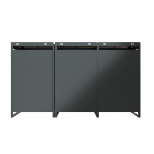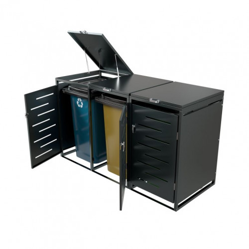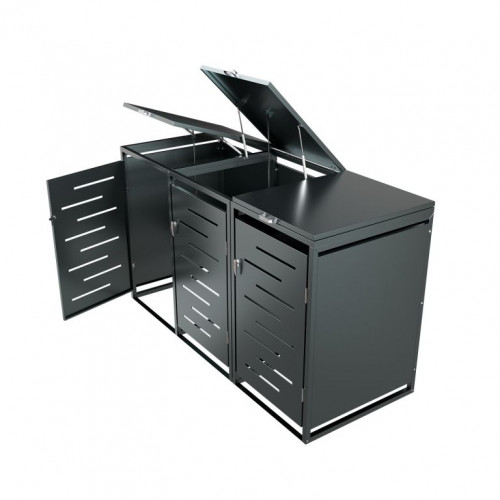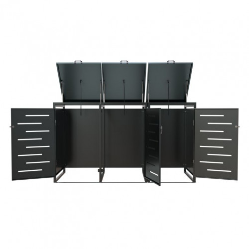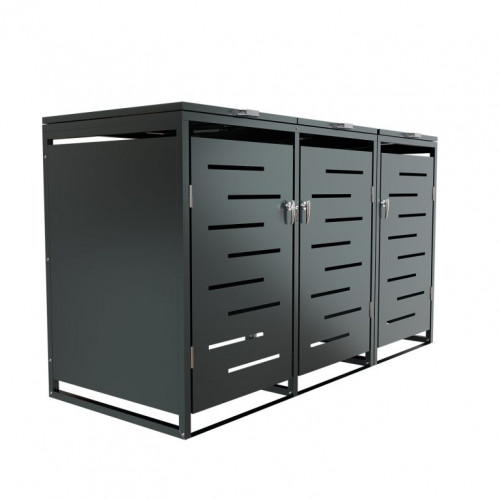 Neprehľadné a neestetické popolnice pred domom? S tým je koniec. Tento kovový prístrešok na tri nádoby premení priestor pri vchode alebo v záhrade na upravené a čisté miesto. V elegantnej antracitovej farbe as vetracími otvormi pôsobí nenápadne, napriek tomu moderne a funkčne zakryje obsah, ktorý má zostať skrytý.