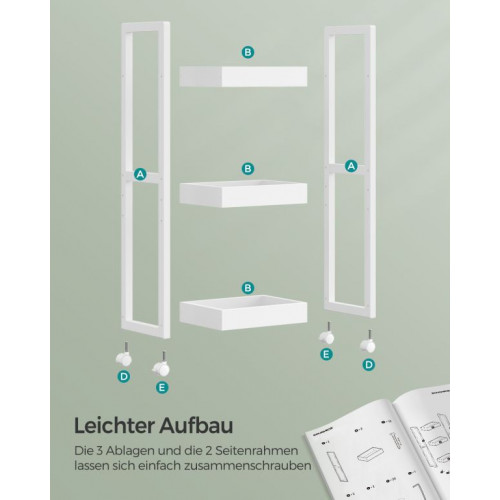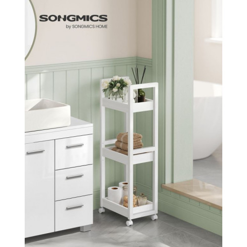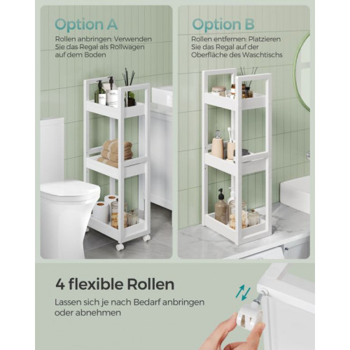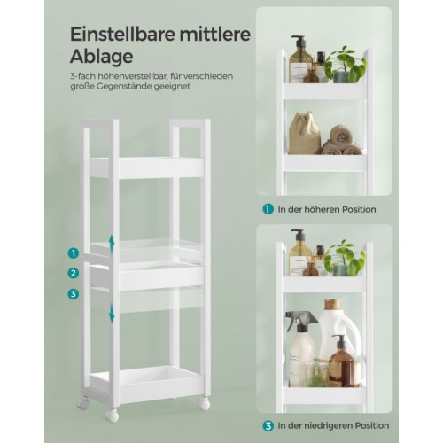 Objavte inteligentné riešenie pre malú kúpeľňu aj kuchyňu. Tento úzky regál s kolieskami vám umožní využiť aj tie najmenšie priestory a premeniť ich na praktické úložisko pre kozmetiku, čistiace prostriedky alebo kuchynské potreby. Vďaka elegantnému dizajnu a bielej farbe sa hodí do každého interiéru a dodá mu svieži vzhľad.