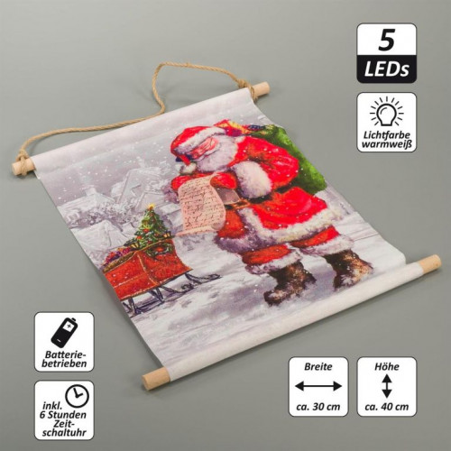 Nástenné maľby sú u nás k dispozícii v rôznych veľkostiach a motívoch. Moderné a kvalitné plátna sú vždy ozdobou vášho domova a rozžiaria nielen vaše okolie. Motív Santa Clausa s 5 teplými bielymi LED diódami vykúzli príjemnú atmosféru a útulnú atmosféru vo vašom obývacom priestore. Najmä v období Vianoc, ale samozrejme aj kedykoľvek inokedy v roku. Batériová prevádzka umožňuje zavesenie nástennej maľby jednotlivo, pretože sa nemusíte starať o otravný kábel. Záves na stenu je možné pripevniť na ľubovoľné miesto.