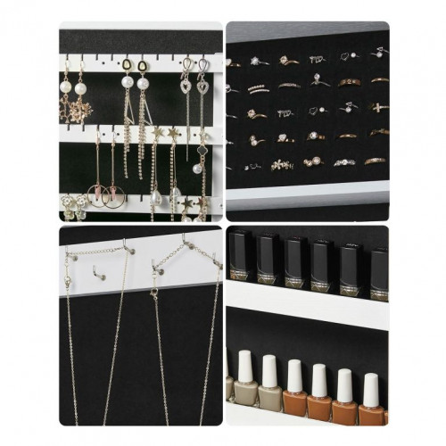 Robustná konštrukcia z MDF zaisťuje dlhú životnosť a stabilitu. Montáž je jednoduchá a rýchla vďaka priloženému príslušenstvu. Šperkovnica je vybavená háčikmi, priehradkami a zamatovým vnútrom na ochranu šperkov. Uzamykateľné dvierka s magnetom chránia vaše cennosti pred stratou či prachom.