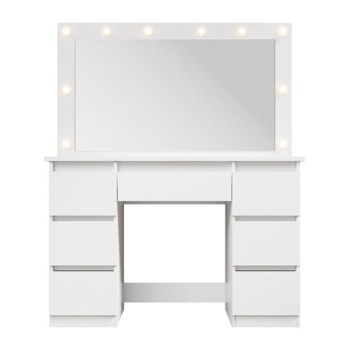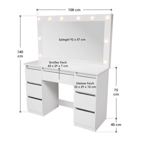 Tento toaletný stolík premení vašu každodennú rutinu líčenia na príjemný rituál. Veľké zrkadlo s nastaviteľným LED osvetlením vytvára ideálne svetelné podmienky kedykoľvek počas dňa a sedem zásuviek zaručuje, že všetko má svoje miesto. Čisté línie a biela povrchová úprava dodávajú vašej spálni alebo izbe mladistvý, moderný vzhľad.