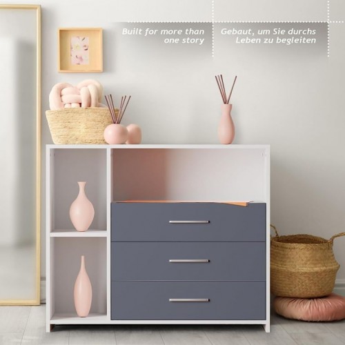 Prebaľovanie na veľkej prebaľovacej ploche - plienky, oblečenie, výrobky pre starostlivosť o dieťa a ďalšie veci na dosah zaistia Vám aj Vášmu dieťaťu pohodlie. Biela farba tohto detského nábytku sa ľahko hodí do rôznych štýlov interiérov. Akonáhle vaše dieťa prebaľovaciemu veku odrastie, môžete prebaľovaciu podložku tohto multifunkčného kusu nábytku jednoducho natrvalo odstrániť. Komoda tak môže byť používaná aj naďalej.