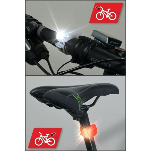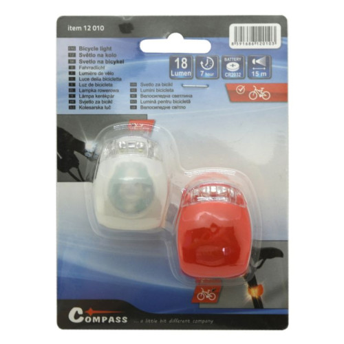 Svetlo na bicykel, kočík alebo kolobežku s jednoduchým systémom upevnenia pomocou pružných silikónových objímok. Dá sa ľahko pripevniť napr. na riadidlá, tyč pod sedadlom alebo inú časť bicykla. Je možné použiť na riadidlá s rôznymi priemermi. Sada sa skladá z dvoch kusov, pričom jedno svetlo je biele a druhé červené, svetlá ponúkajú dosah do 15 metrov a svetelný tok 18 lm. Ovládanie je riešené stlačením skrytého spínača na hornej časti. Svetlo tak ponúka 3 režimy (trvalé svietenie / rýchle blikanie / pomalé blikanie). Batérie možno jednoducho vymeniť odstránením silikónového obalu z tela svietidla a odobratím krytu batérií.