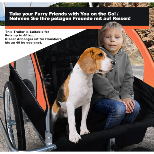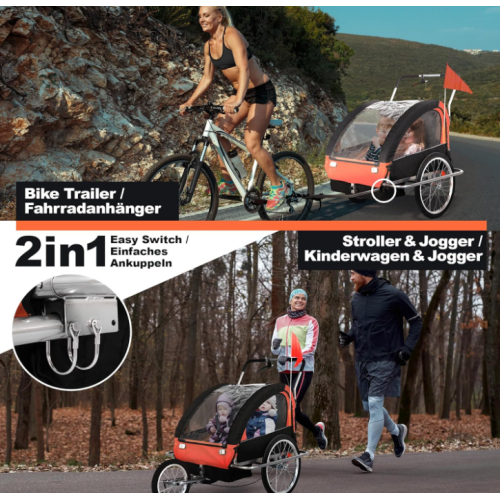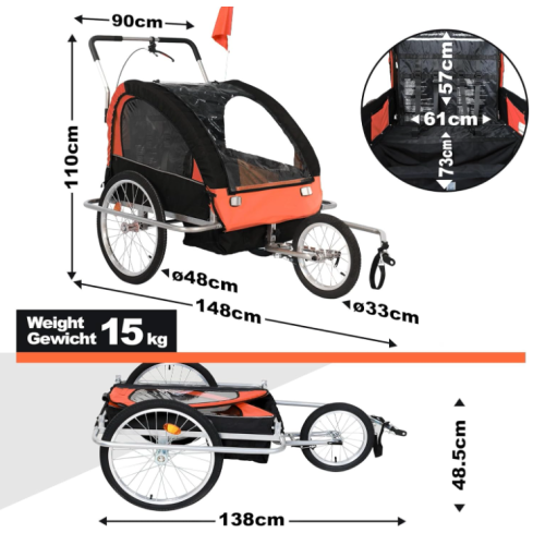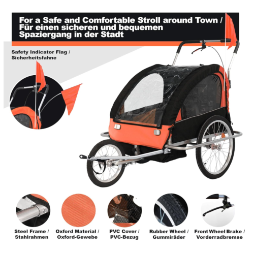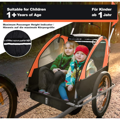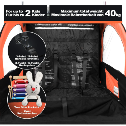 Predstavujeme náš detský príves za bicykel – tento príves má stredovú os s priemerom 10 mm a ponúka dostatok miesta pre dve deti s celkovou hmotnosťou až 40 kg. Možno ho použiť aj ako kočík, čo z neho robí skvelú voľbu pre mestské rodiny, a to nielen vďaka jeho funkčnosti, ale aj pre jednoduché prechádzky po meste s dvoma deťmi. Kočík je vybavený dvoma 5-bodovými bezpečnostnými pásmi, reflexnými pásikmi vpredu a vzadu, brzdou predného kolesa a vlajočkou. Náš príves za bicykel sa dá ľahko premeniť na kočík, čo výrazne uľahčuje každodenné cestovanie po meste a šetrí veľa úložného priestoru. Tento detský príves môžete použiť kdekoľvek – vezmite svoje dieťa so sebou do školy alebo škôlky, vezmite s ním týždenný nákup alebo ho použite ako kočík na ihriskách a v parkoch. Pneumatiky by mali byť nahustené na tlak 20–50 PSI pomocou ručnej alebo nožnej pumpy (tlaková hadica môže spôsobiť prehustenie).