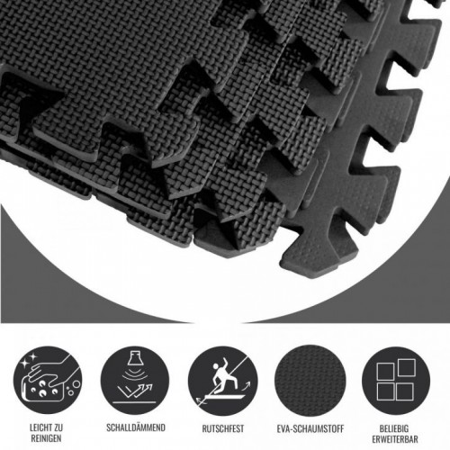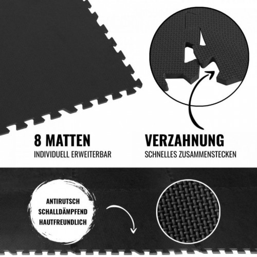 Súprava ochranných podložiek Gorilla Sports obsahuje vždy 8 kusov, ktoré do seba môžete flexibilne zasunúť vďaka ich spojovacím prvkom. Ochranné rohože sú ideálne na ochranu vášho vybavenia a príslušenstva. Izolujú teplo, hluk a zvuk a sú príjemné na dotyk. Ľahko sa tiež čistia a sú vhodné ako podložka na cvičenie na podlahe. Upozornenie: Z dôvodu možného zafarbenia je sada ochranných rohoží iba podmienečne vhodná do miestností s podlahovým vykurovaním. Na zaistenie bezpečnej prepravy sú naše ochranné rohože ošetrené uvoľňovacím prostriedkom. Pokiaľ sa na ochranných rohožiach objaví olejový film, je možné ho jednoducho zmyť čistou vodou a handričkou. Prípravok nie je škodlivý. Dôrazne neodporúčame používať na čistenie podložiek chemické prostriedky, môžu spôsobiť zmenu farby povrchu.
