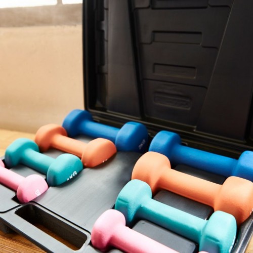 Šedé puzdro ponúka priestor pre štyri páry činiek rôznych veľkostí a hmotnostných tried, ktoré sú už súčasťou sady. Každá z pestrofarebných farieb zodpovedá inej hmotnosti medzi 0,5 a 2 kilogramami. S touto sadou ušetríte miesto a zároveň vytvoríte poriadok.