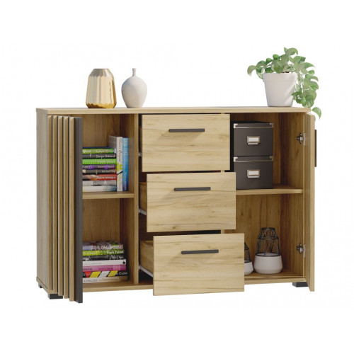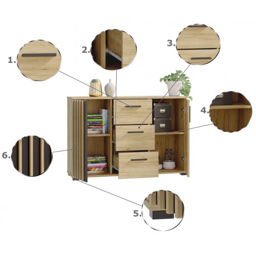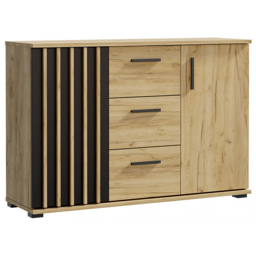 Táto moderná komoda kombinuje minimalistický, loftový charakter s maximálnou funkčnosťou. Jej korpus v sýto čiernej farbe dokonale kontrastuje s čelami v teplom dekore remeselného duba, vďaka čomu sa nábytok stáva výrazným akcentom v obývačke, chodbe alebo spálni.
