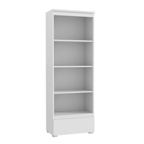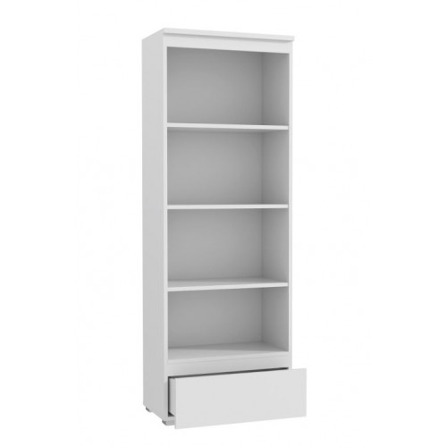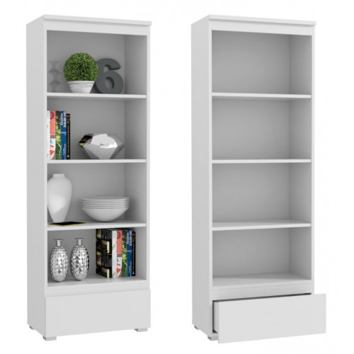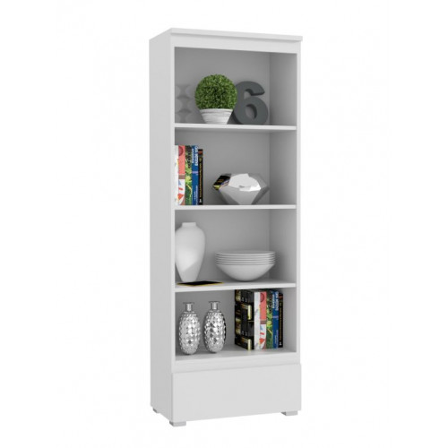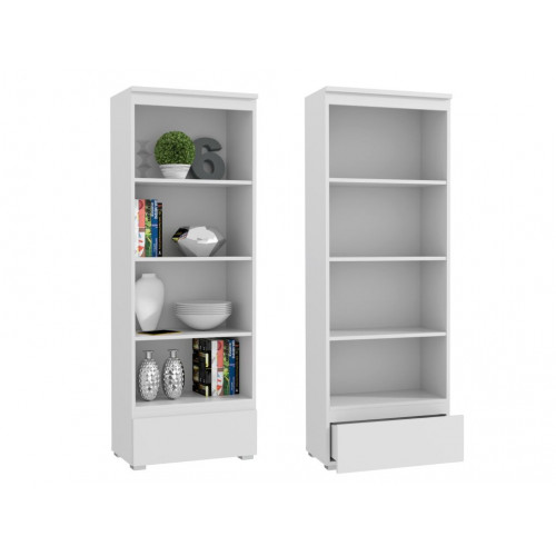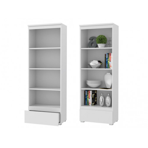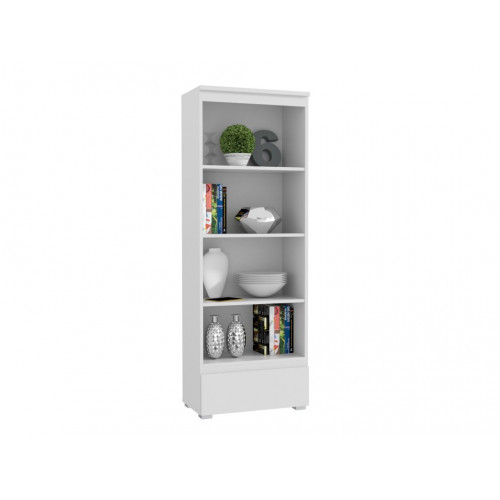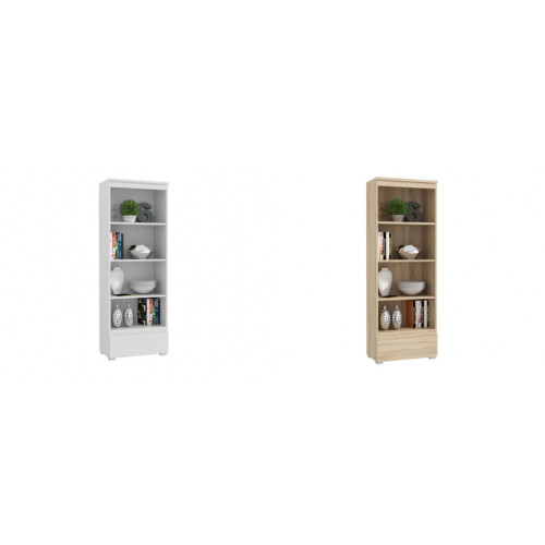 Moderná priestranná policová skriňa spája minimalistický dizajn s praktickosťou. Je vybavená štyrmi otvorenými policami na knihy, zakladače, dekorácie alebo kancelárske doplnky, ako aj hlbokou výsuvnou zásuvkou na drobné predmety a dokumenty.