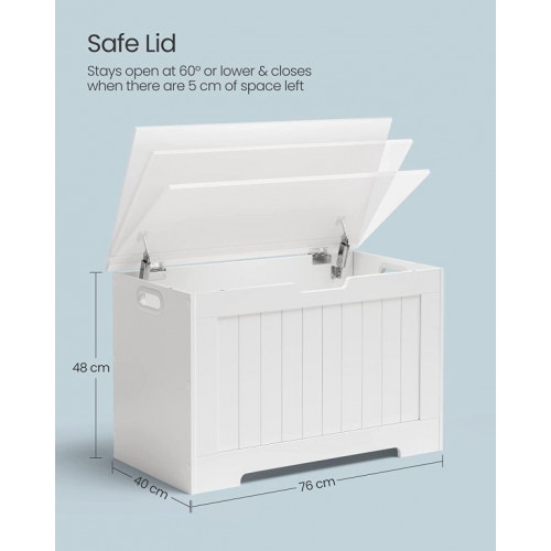Táto elegantná biela úložná lavica kombinuje dostatok priestoru, pohodlné sedenie a bezpečný mechanizmus otvárania veka. Vďaka svojej robustnej konštrukcii a nosnosti až 136 kg pojme deky, oblečenie, hračky a knihy bez narušenia čistého vzhľadu vášho interiéru. Bočné úchyty uľahčujú prenášanie a vysokokvalitný povrch z drevotriesky sa ľahko udržiava.