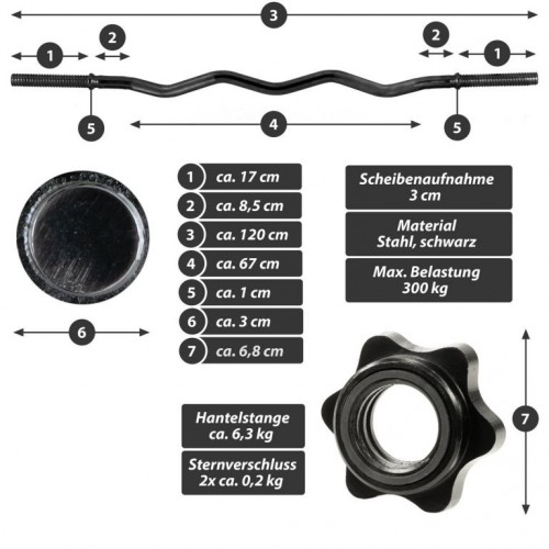 Optimálna činka na použitie v posilňovni aj doma. Zakrivený tvar tyče umožňuje rôzne možnosti úchopu na použitie rôznych partií svalov paží a umožňuje cielene precvičovať konkrétne svalové skupiny i komplexné precvičenie celého tela. Ideálne pre náročný tréning s menšou záťažou zápästia ako s činkou. Vďaka zakrivenému tvaru je obzvlášť vhodná pre efektívny a efektívny tréning paží. Je vhodná pre dostupné záťažové dosky s priemerom otvoru 30 mm. Hviezdicové zámky, ktoré je možné rýchlo vymeniť, bezpečne fixujú závažia na tyči činky a zaručujú jednoduchú výmenu závaží.