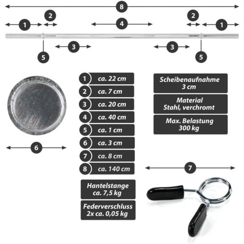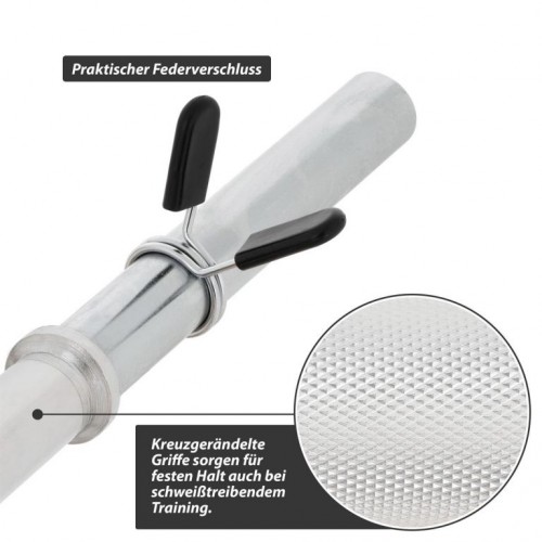 Optimálna činka pre použitie v posilňovni aj doma, vhodná na tréning hrudníka, paží, ramien, krku, posilňovanie, rehabilitačný šport, kulturistiku, bench press, mŕtvy ťah, drepy, výpady, kľučky atď. Doska je upevnená poistným krúžkom, ktorý zabraňuje skĺznutiu závažia počas pohybu. Rýchlovýmenné pružinové zámky bezpečne fixujú závažie na tyči činky a zaručujú pohodlnú výmenu závažia. Rebrované rukoväte na tyči umožňujú bezpečné uchopenie tyče.