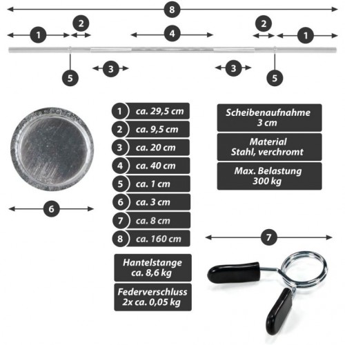 Vhodná pre tréning hrudníka, paží, ramien, krku, posilňovanie, rehabilitačné športy, kulturistiku, bench press, mŕtve ťahy, drepy, výpady, kliky atď. Podperná tyč na činky MAXXIVA je vhodná pre všetky komerčne dostupné záťažové dosky s držiakom dosky s priemerom 3 cm - priemer otvoru 30 / 31 mm. Pultová doska je upevnená poistným krúžkom, ktorý zabraňuje skĺznutiu závažia počas pohybu. Rýchlovýmenné pružinové zámky bezpečne upevňujú závažia k činke a zaručujú pohodlnú výmenu závažia. Rukoväte s krížovým závitom na tyči umožňujú bezpečné uchopenie tyče.
