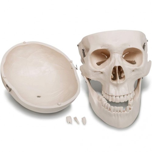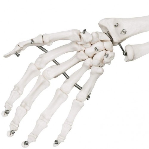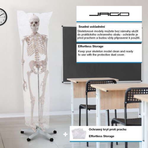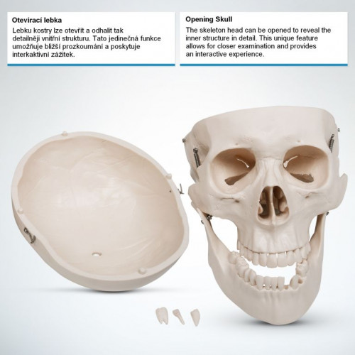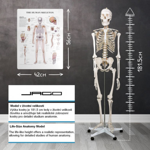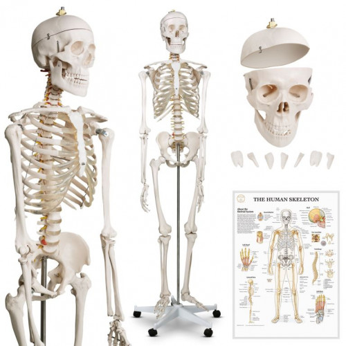 Viac ako 200 verne reprodukovaných kostí Vám umožní nahliadnuť pod kožu ľudského tela. Aby ste si mohli skontrolovať aj to, čo sa nachádza v hlave, je lebka navrhnutá tak, aby mohla byť odklopená. Hlava všeobecne prichádza aj s ďalšími zaujímavými detailami. Dolná čeľusť je pohyblivá a môžete z nej extrahovať rezák, stoličku alebo špicák. Spoznajte telo s kostrou ľudskej anatómie. Vzdelávacia grafika vo formáte plagátu Vám pomôže lepšie porozumieť telu. Kostra, vyrobená z odolného PVC, vydrží veľa. Takže jej môžete ľahko amputovať nohu a znova ju pripojiť. To isté platí pre ostatné končatiny. Táto kostra anatómie je zvlášť vhodná pre použitie v škole pri lekciách biológie, pretože má aj zavesenie a rolovací stojan, ktorý umožňuje jej prepravu z učebne do učebne.