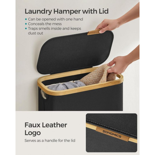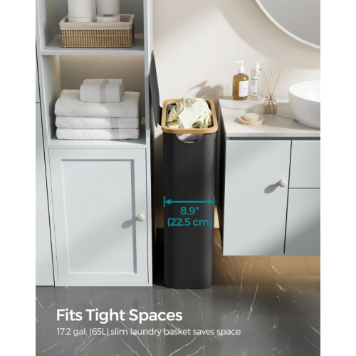 Objavte elegantné riešenie pre každodenné skladovanie bielizne – tento úzky košík na bielizeň so štýlovým bambusovým okrajom premení aj malý priestor na útulné miesto. Jeho objem 65 litrov ponúka dostatok priestoru pre celú rodinu, zatiaľ čo praktické veko chráni vaše súkromie a chráni bielizeň pred pohľadmi a prachom.