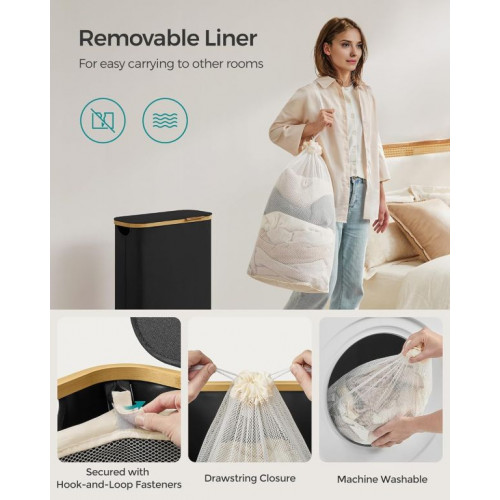 Úzky košík na bielizeň 65 l, čierny, bambusový okraj