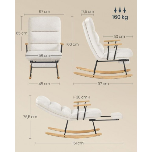 Doprajte si dokonalý relax po náročnom dni. Toto hojdacie kreslo s mäkkým krémovým čalúnením a nastaviteľným operadlom vás pohodlne objíme a ponúkne ideálne miesto na čítanie, sledovanie obľúbeného filmu alebo popoludňajší spánok. Jeho štýlový vzhľad a prírodné drevené nohy dodajú vášmu domovu nádych elegancie a pokoja.