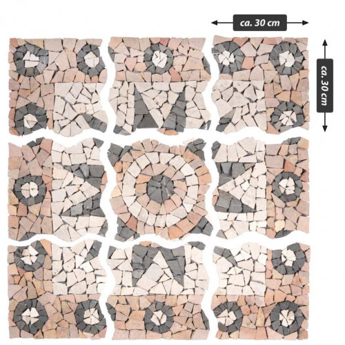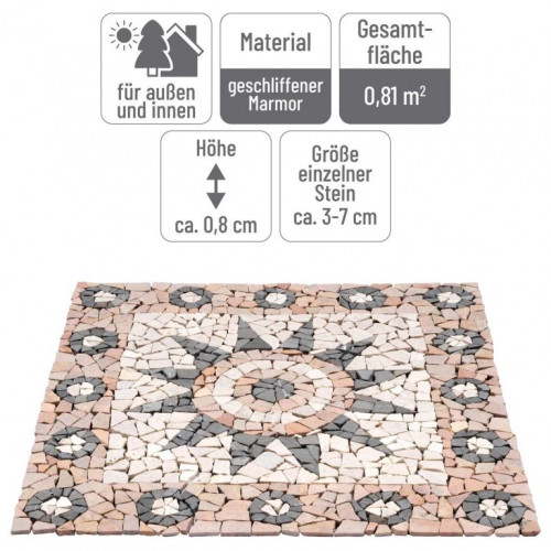 Táto krásna mozaika so svojimi jemnými prírodnými farbami zvýrazní váš vchod do domu, chodbu alebo terasu. Vašej kreativite sa medze nekladú. Elegantná mramorová mozaika bola ručne nalepená na 9 špeciálnych podložiek pre jednoduchú inštaláciu. Lámaná mozaika je vyrobená z lešteného mramoru, hrany sú zaoblené. Pri vhodnom spracovaní je mozaika z prírodného kameňa vhodná ako obklad alebo dlažba a je možné ju použiť v interiéri aj exteriéri.