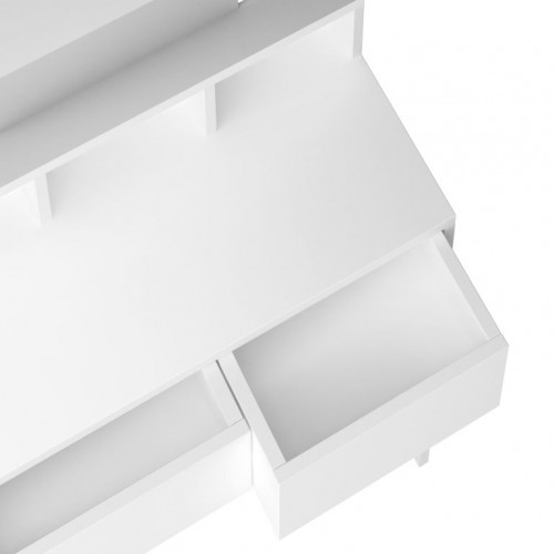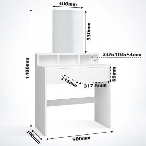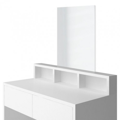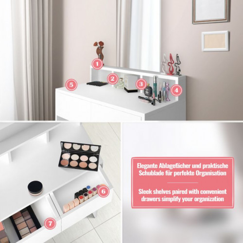 Tento kozmetický stolík má priestrannú dosku so zrkadlom, 2 zásuvky a 3 otvorené priehradky, ktoré poskytujú dostatok priestoru pre všetky vaše kozmetické potreby.Sofistikované zrkadlo, múdre police a zásuvky zaisťujú organizované skladovanie.
